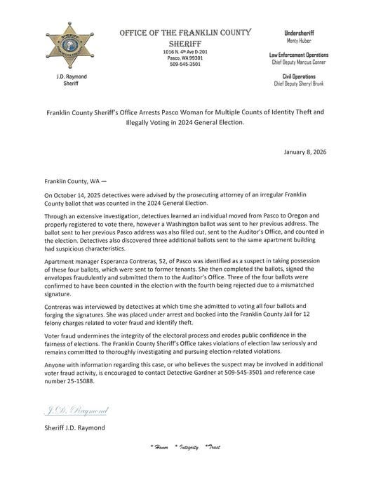 Yesterday, the Franklin County Sheriff’s Office (FCSO) posted results from a recent case via the Franklin County prosecuting attorney regarding a suspicious ballot that was counted in the 2024 General Election. According to FCSO, detectives were notified on Oct. 14, 2025, and began an investigation.